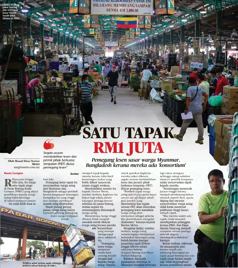 02112020 Katanya sebelum ini peniaga warga asing ada tapak yang disewa dari rakyat tempatan namun kini mereka berniaga secara bebas tanpa memerlukan tapak tetapi tetap meraih pendapatan puluhan ribu sebulan. 18062020 LEBIH 50 tapak pasar borong dan 100 tapak pasar harian masih tidak dibuka di PBKL. Oleh Skuad Khas Harian Metro.